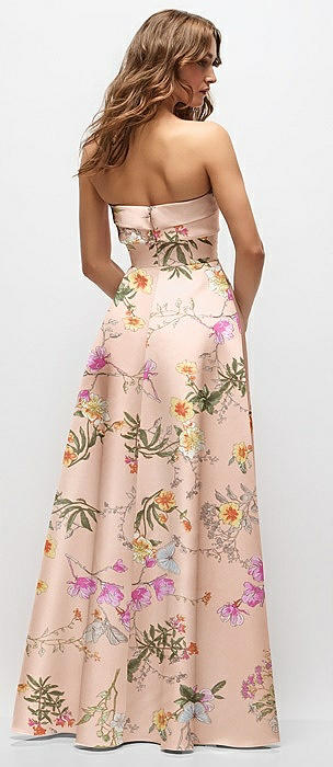 Strapless Hand-Pleated Bodice Floral Satin Maxi Dress with Full Pleated Skirt in butterfly botanica pink sand