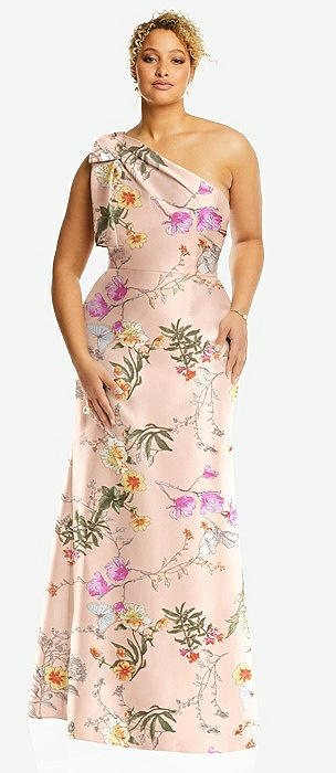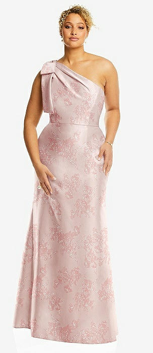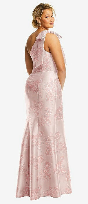 Bow One-Shoulder Floral Satin Trumpet Gown in cottage rose larkspur