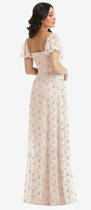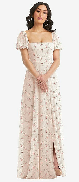 Puff Sleeve Chiffon Maxi Dress with Front Slit in coquette floral print