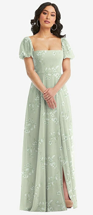 Puff Sleeve Chiffon Maxi Dress with Front Slit in mint green floral