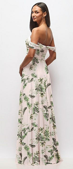 Off-the-Shoulder Draped Chiffon Maxi Dress in palm beach print
