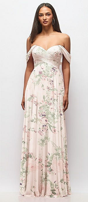 Off-the-Shoulder Draped Chiffon Maxi Dress in blush garden