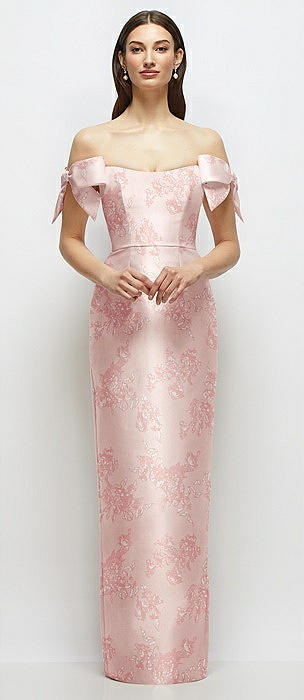 Basque-Neck Floral Satin Column Maxi Dress with Off-the-Shoulder Bows in bow and blossom print