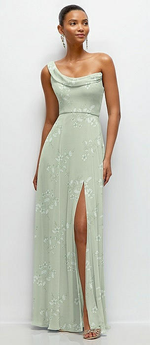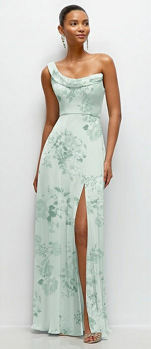 Chiffon One-Shoulder Maxi Dress with Draped Cowl Neckline in mint green floral