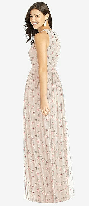 Shirred Skirt Jewel Neck Halter Dress with Front Slit in coquette floral print