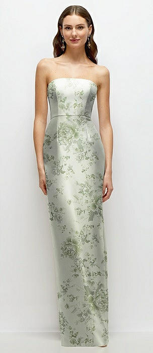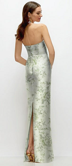 Strapless Floral Satin Column Dress with Back Slit in sage cottage rose