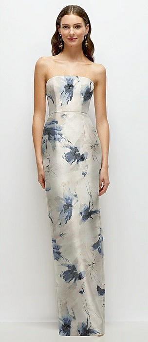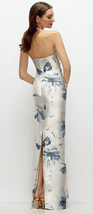 Strapless Floral Satin Column Dress with Back Slit in inkwash blue floral