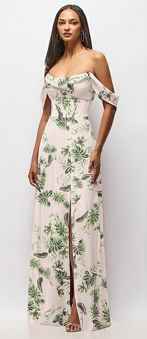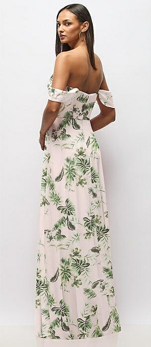 Chiffon Corset Maxi Dress with Removable Off-the-Shoulder Swags in palm beach print