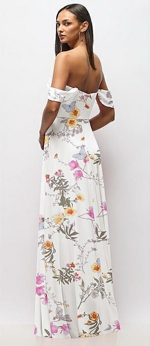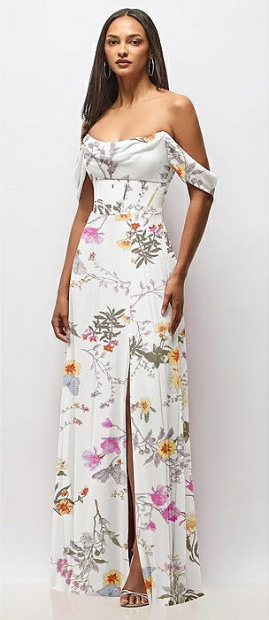 Chiffon Corset Maxi Dress with Removable Off-the-Shoulder Swags in butterfly botanica ivory