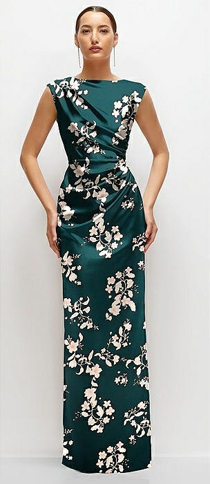 Floral High Neck Sleeveless Cap Shoulder Satin Maxi Dress in vintage primrose evergreen
