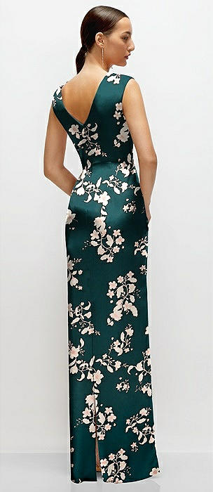 Deep V-back Floral Satin Trumpet Dress with One-Shoulder Cascading Bow in sage cottage rose