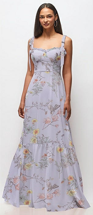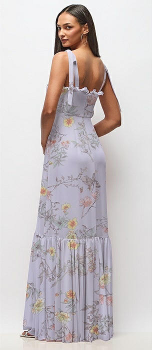 Tie-Shoulder Bustier Bodice Ruffle-Hem Maxi Dress in butterfly botanica silver dove