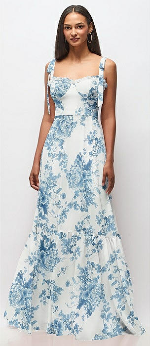 Tie-Shoulder Bustier Bodice Ruffle-Hem Maxi Dress in bleu garden