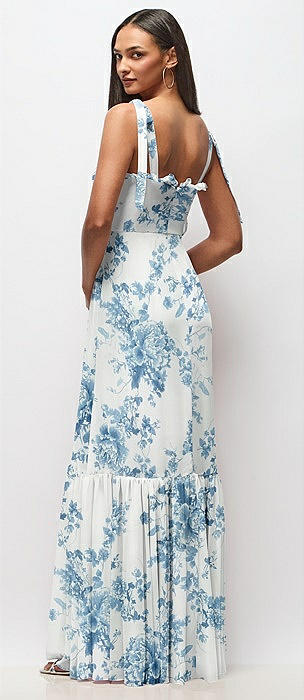 Tie-Shoulder Bustier Bodice Ruffle-Hem Maxi Dress in coquette floral print