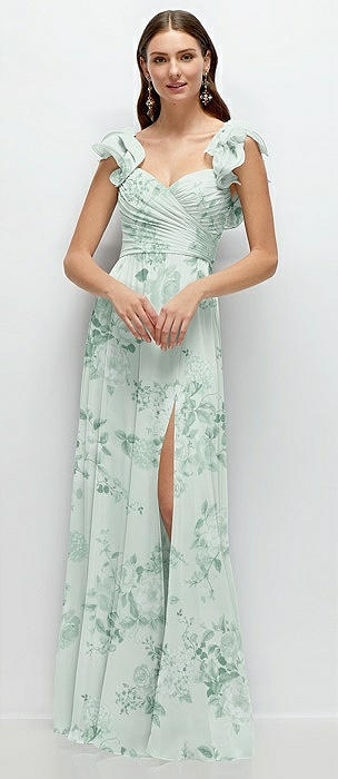 Asymmetrical Ruffle Chiffon Bias Slip Maxi Dress in mint green floral