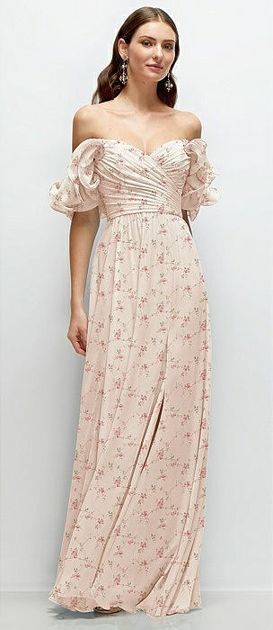 Strapless Pleated Surplice Chiffon Maxi Dress with A-Line Skirt in coquette floral print