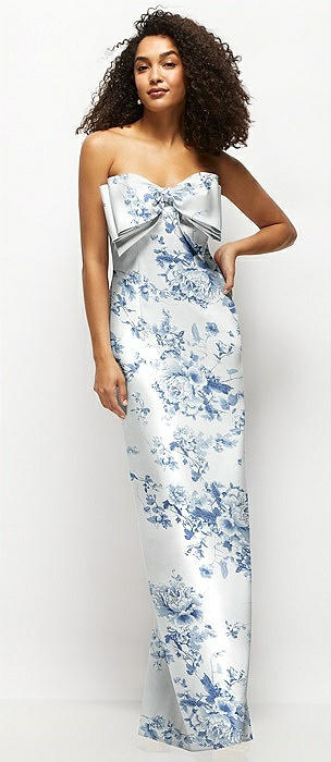 Strapless Floral Satin Column Maxi Dress with Oversized Bow in cottage rose larkspur