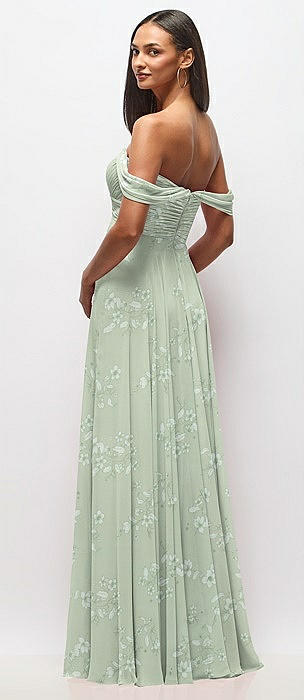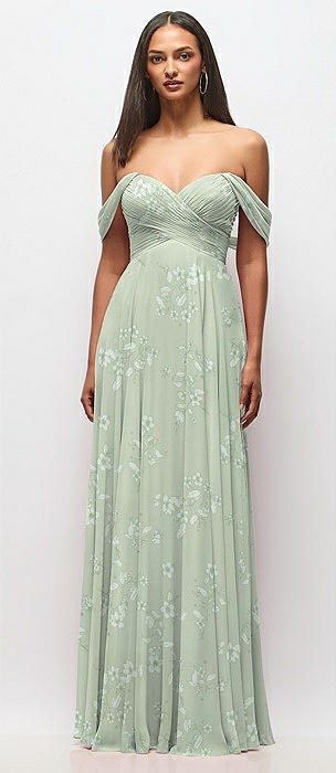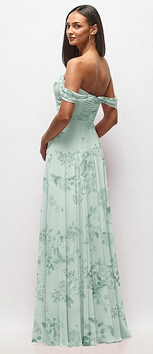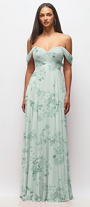Off-the-Shoulder Draped Chiffon Maxi Dress in mint green floral