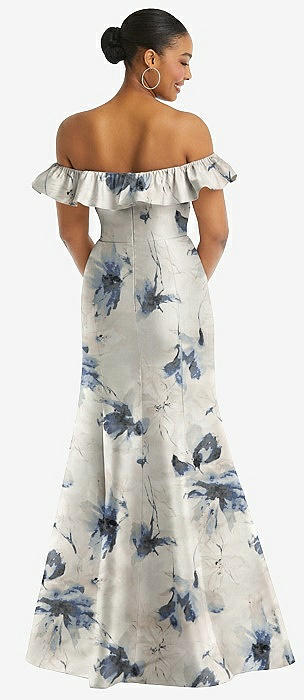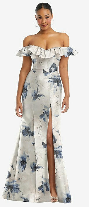 Off-the-Shoulder Ruffle Neck Floral Satin Trumpet Gown in inkwash blue floral