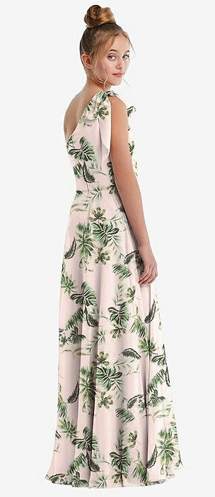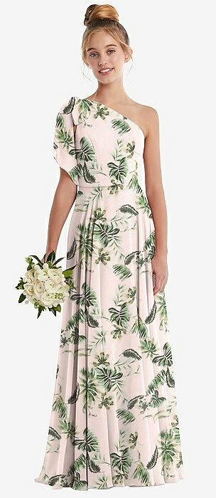 One-Shoulder Scarf Bow Chiffon Junior Bridesmaid Dress in palm beach print