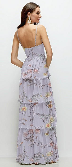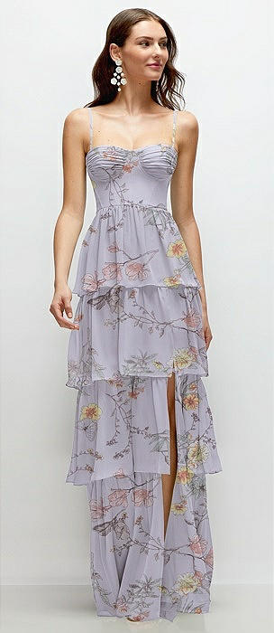 Bustier-Style Chiffon Tiered Ruffle Maxi Dress with Adjustable Straps in butterfly botanica silver dove