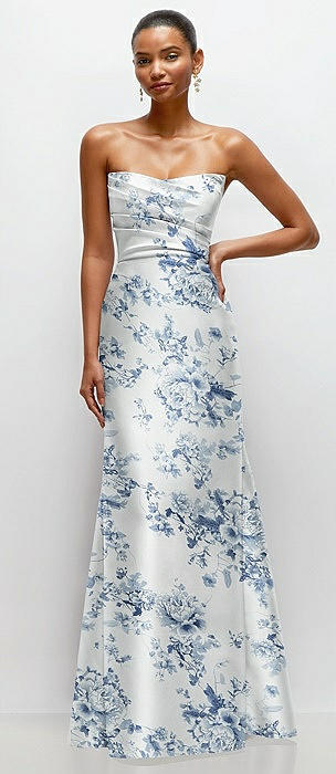 Strapless Cat-Eye Draped Bodice Floral Satin Tumpet Dress in cottage rose larkspur