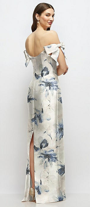 Basque-Neck Floral Satin Column Maxi Dress with Off-the-Shoulder Bows in inkwash blue floral