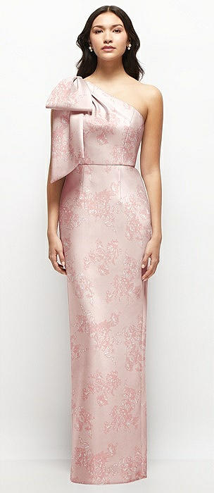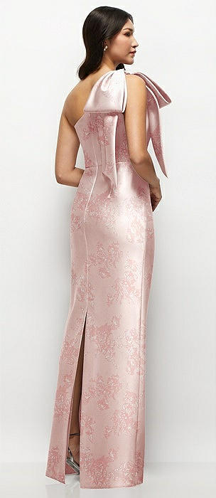 Oversized Bow One-Shoulder Floral Satin Column Maxi Dress in butterfly botanica pink sand
