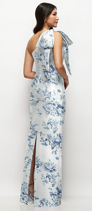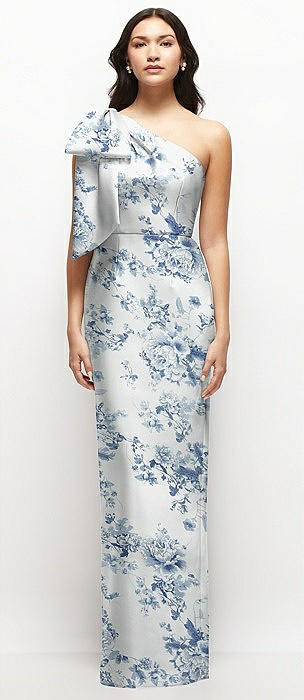 Oversized Bow One-Shoulder Floral Satin Column Maxi Dress in cottage rose larkspur