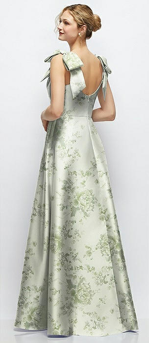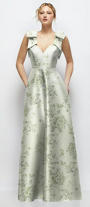 Deep V-Neck Floral Satin Ball Gown with Shoulder Bows in sage cottage rose