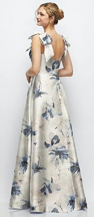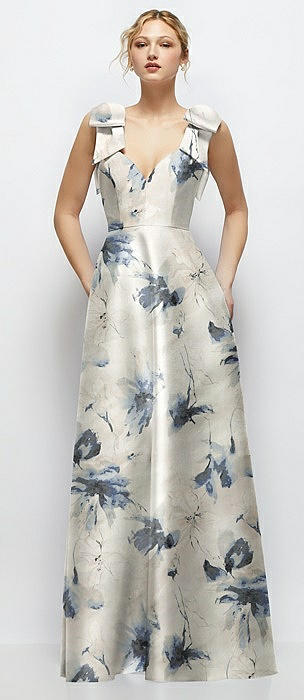 Deep V-Neck Floral Satin Ball Gown with Shoulder Bows in inkwash blue floral