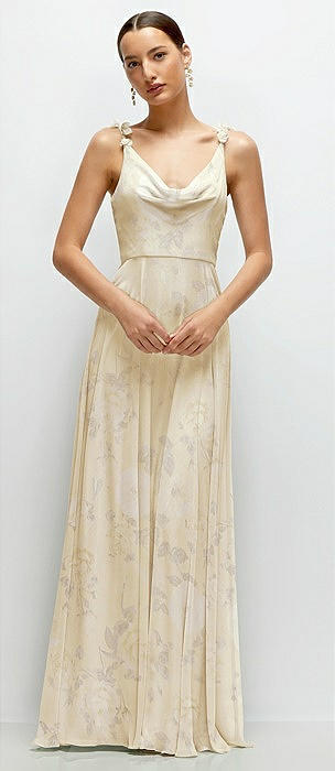 Cowl Neck Chiffon Maxi Dress with Hand-Worked Petal Straps in coquette floral print