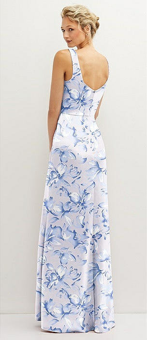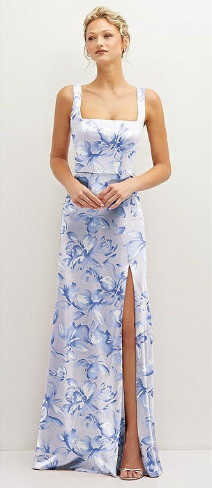 Floral Square-Neck Satin A-line Maxi Dress with Front Slit in magnolia sky