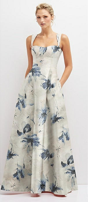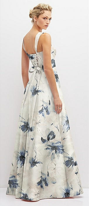 Floral Lace-Up Back Bustier Satin Dress with Full Skirt and Pockets in inkwash blue floral