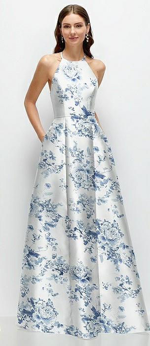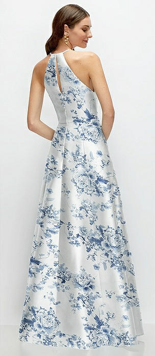 Jewel Neck Halter Full A-Line Satin Floral Maxi Dress in porcelain blue seraphina floral