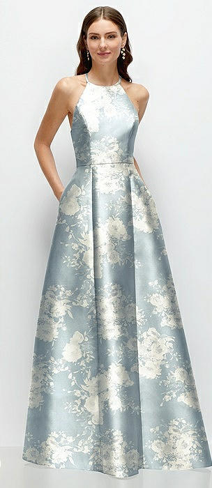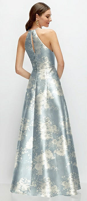 Jewel Neck Halter Full A-Line Satin Floral Maxi Dress in cottage rose larkspur
