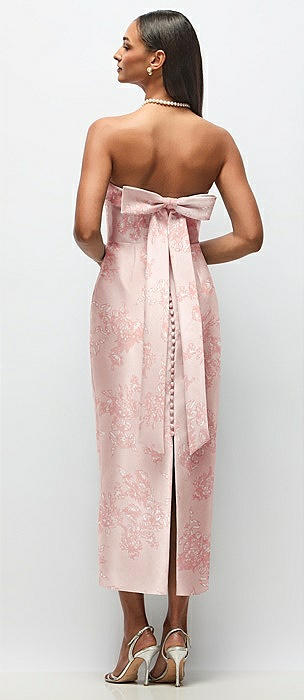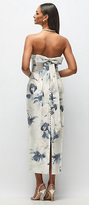 Strapless Cuff Floral Satin Midi Dress with Column Skirt & Back Bow in bow and blossom print