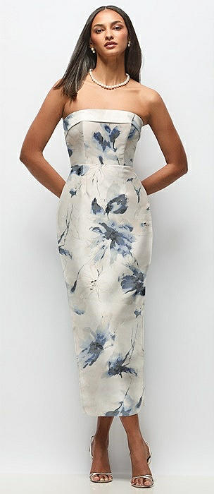 Strapless Cuff Floral Satin Midi Dress with Column Skirt & Back Bow in inkwash blue floral