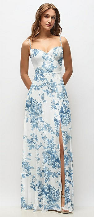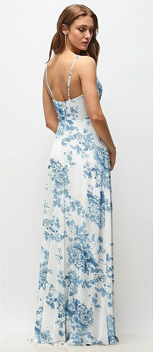 Wrap Bodice Floral Chiffon Maxi Dress with Adjustable Spaghetti Straps in cottage rose dusk blue
