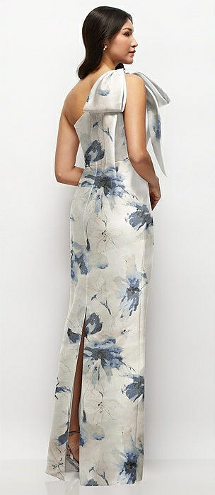 Oversized Bow One-Shoulder Floral Satin Column Maxi Dress in inkwash blue floral