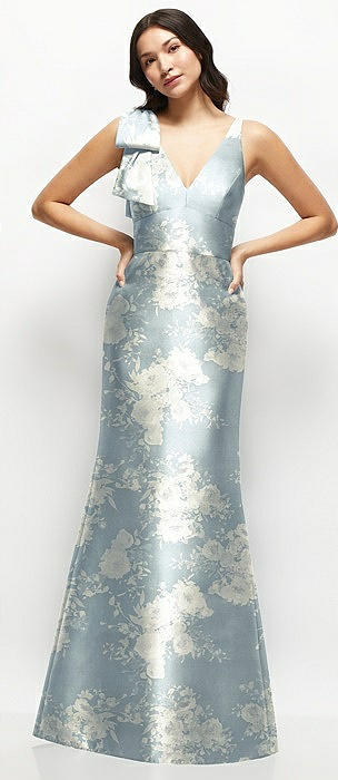 Deep V-back Floral Satin Trumpet Dress with One-Shoulder Cascading Bow in porcelain blue seraphina floral