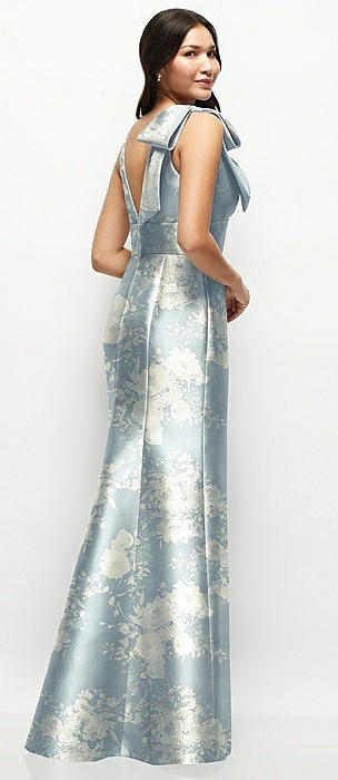 Deep V-back Floral Satin Trumpet Dress with One-Shoulder Cascading Bow in bow and blossom print