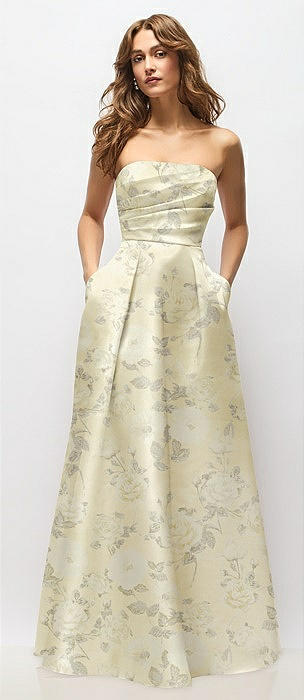 Strapless Hand-Pleated Bodice Floral Satin Maxi Dress with Full Pleated Skirt in butter yellow floral