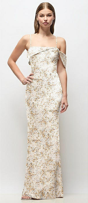 Asymmetrical Cuff Neck Floral Stretch Satin Bias Maxi Dress with Adjustable Spaghetti Straps in golden hour