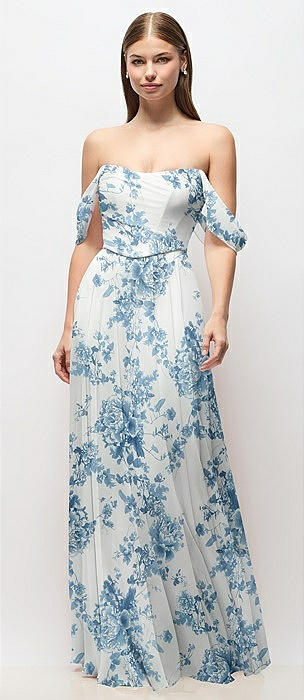 Off-the-Shoulder Basque Corset Floral Chiffon Maxi Dress in cottage rose dusk blue