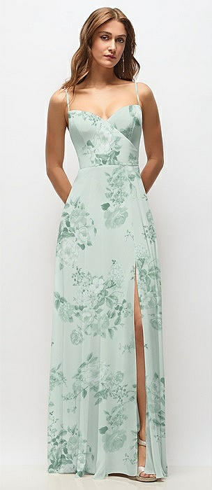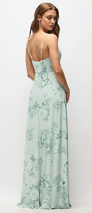 Wrap Bodice Floral Chiffon Maxi Dress with Adjustable Spaghetti Straps in mint green floral