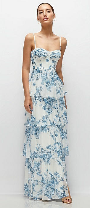 Bustier-Style Chiffon Tiered Ruffle Maxi Dress with Adjustable Straps in coquette floral print