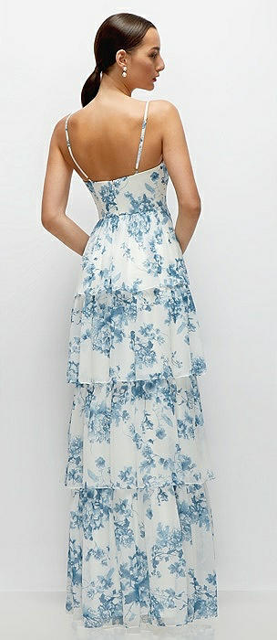 Bustier-Style Chiffon Tiered Ruffle Maxi Dress with Adjustable Straps in butterfly botanica silver dove