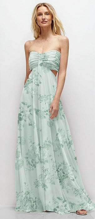Strapless Empire Waist Cutout Maxi Dress with Covered Button Detail in mint green floral