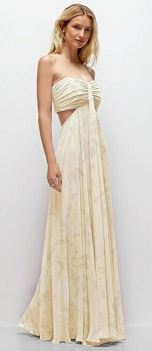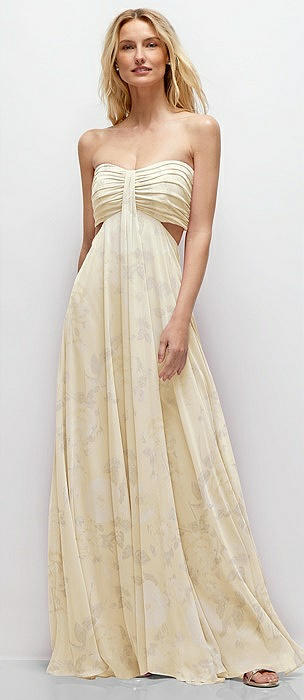 Strapless Empire Waist Cutout Maxi Dress with Covered Button Detail in butter yellow floral